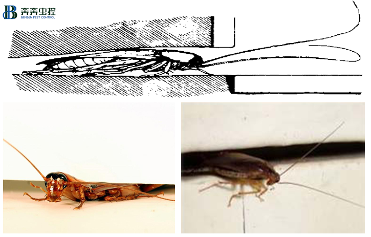 蟑螂在縫隙中棲息時(shí),足緊貼著身體,尾須平伸或者與支撐面接觸,觸角常伸向外面,不時(shí)揮動(dòng),保持警戒狀態(tài)。