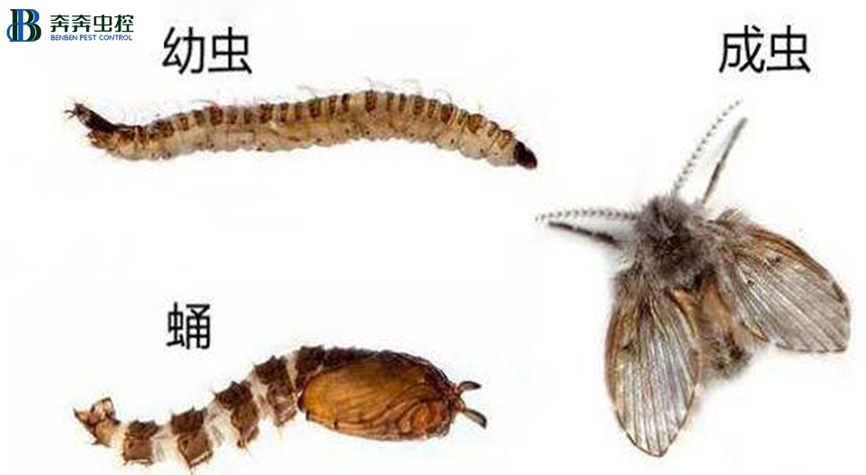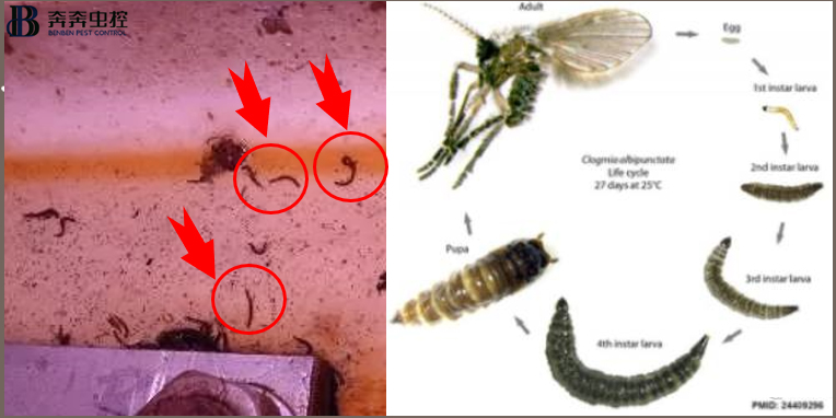 蛾蠓偏好在潮濕的凝膠狀污垢層表面產(chǎn)卵(30-100 枚/次),常見的孳生地包括排水管內(nèi)壁、排水口濾網(wǎng)、垃圾桶內(nèi)壁、盆栽托盤等位置的污垢層。幼蟲取食污垢層中的藻類、細(xì)菌、真菌等。在 21℃,卵期 32-48小時(shí),幼蟲期 8-24天,蛹期 20-40小時(shí)。